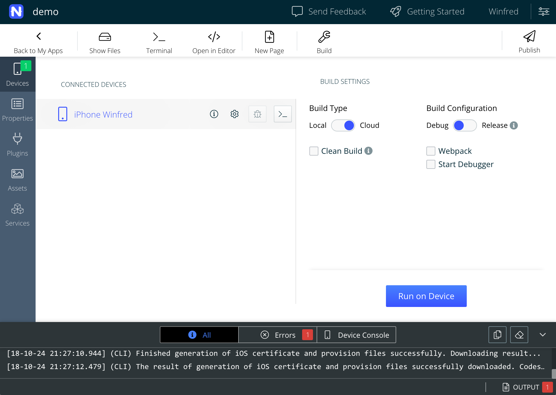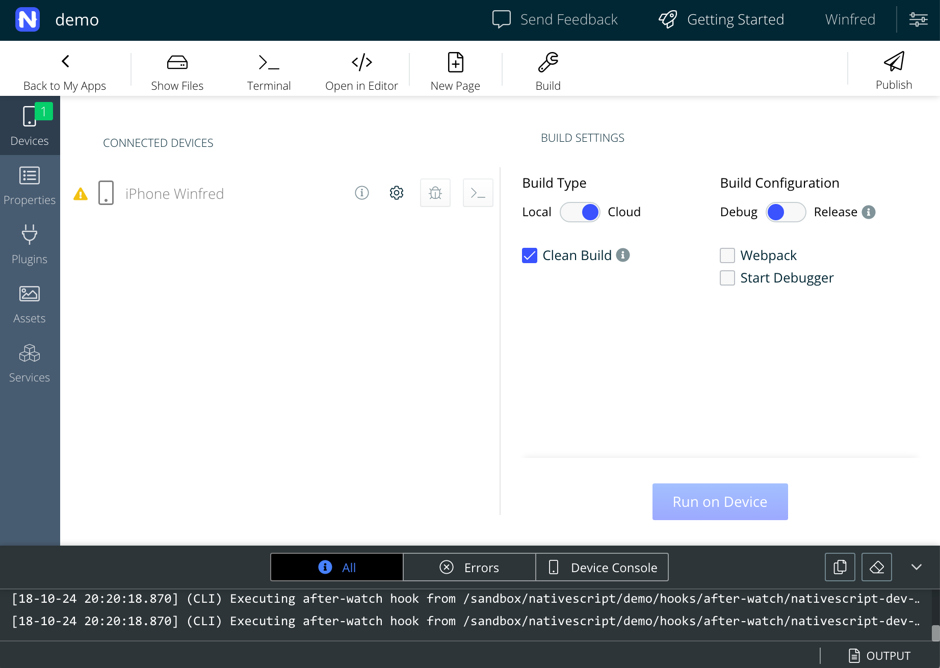Next, you can open the exercise folder in NativeScript sidekick. From NativeScript Sidekick you can open the project in a IDE of choice and run local builds or cloud build.
