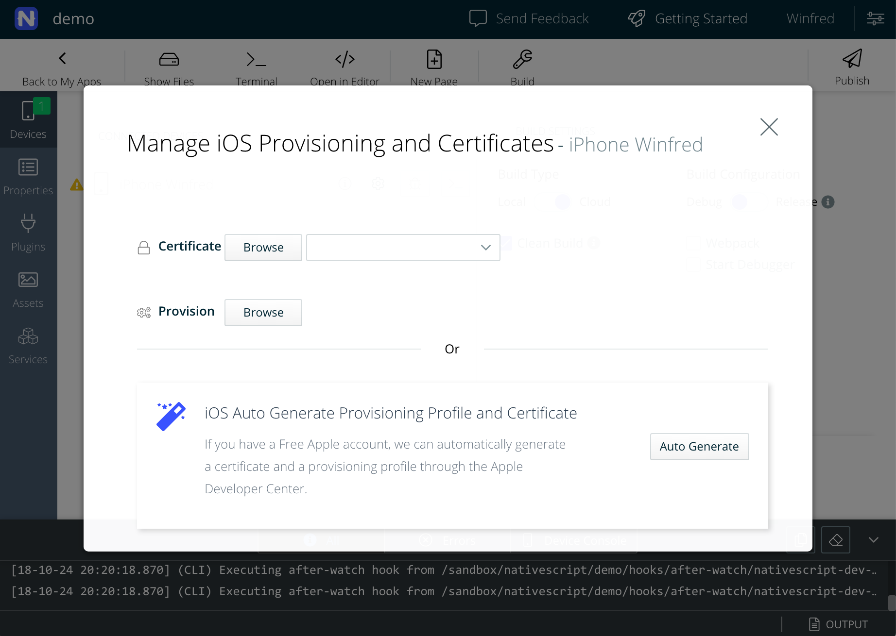 If you don’t have a certificate and provisioning profile yet, you can generate them by clicking the